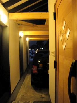 テラスの灯りを付けると、手前の格子に光りが抜けます。