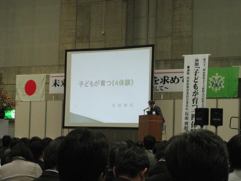 講演会は「子どもが育つ《4体験》」と題して、山形県教育委員会委員長の長南博昭氏の講演でした。
