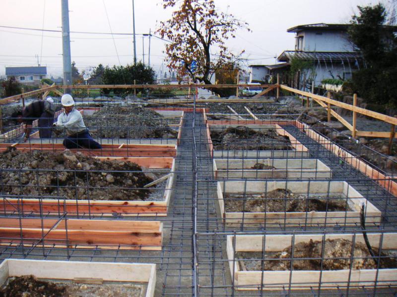 写真は、基礎に必要な鉄筋を配筋しているところです。