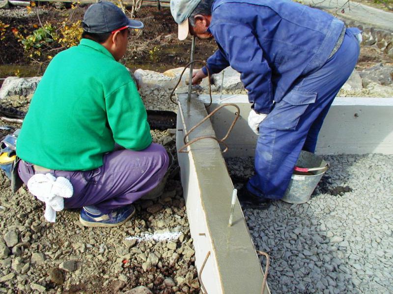天端均し(てんばならし)とは、基礎の天端を水平にするために、モルタルで平らにすることを言います。コンクリートを打設するとき、あらかじめモルタルの厚み分(15mm程度)下げて打ちます。型枠を外した後、均し定規(小幅板など)を水平に当て、それに沿って金鏝(かなごて)で均します。この作業で水平が確保されないと、基礎の上に設置される土台の水平が保たれません。左官職人さんは、気を抜けませんね。