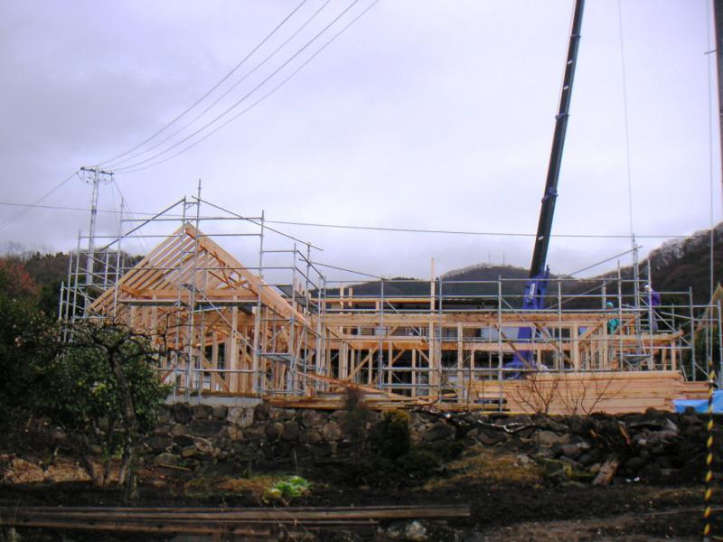 土台据え(どだいすえ)から棟上げ(むねあげ)までの一連の工程が建て方(たてかた)です。あらかじめ作業場で刻んでおいた材料を搬入し、段取り良く組み上げていきます。現在ではクレーンを使うことが一般的で、作業性に優れています。