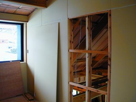 内装材として最もよく使われている材料は、石膏ボードでしょう。(写真は下地材に石膏ボードを取り付けている途中です。)