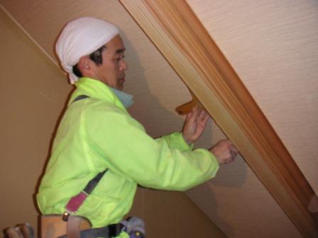 写真は、壁紙を傾斜天井に張っているところです。
