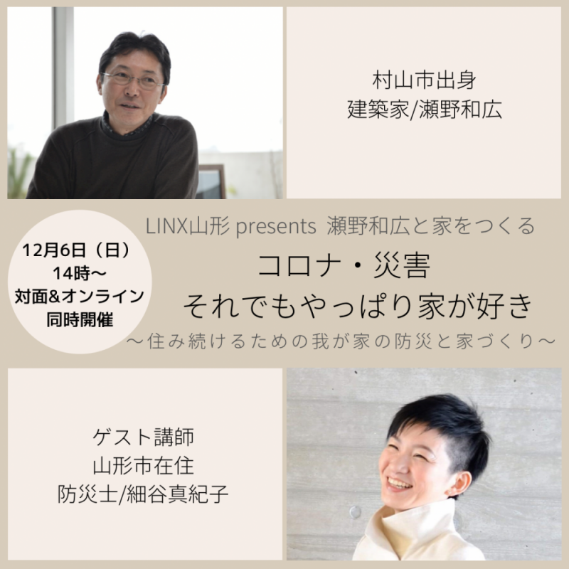 弊社が参加している家づくりグループ「LINX(リンクス)山形」が主催するオンライン、対面同時開催のセミナーのご案内です。山形市在住の防災士・細谷真紀子氏と、村山市出身の建築家・瀬野和広氏によるコラボセミナーです。昨今の自然災害を鑑み、弊社でも自然災害時に対応できる家づくりの重要性を問いながら設計に頭を悩ませますが、個人レベルで今すぐに生かせる防災対策を提唱している防災士の細谷氏。そして、被災時の仮設住宅等に流通材を用いて融通の利く建築構法を開発・実践している瀬野氏。どちらも住み続けるためのエッセンスが、たっぷりと入ったセミナーになること間違いなし。コロナ禍における住まい方も気になるところ。ぜひ聞いて実践してみましょう!申し込みはこちらのサイトから※オンラインと対面のどちらを希望かお書きください日時:2020.12.06 SUN 14:00 START (参加費無料)第1部:防災士/細谷真紀子氏による 我が家の防災セミナー第2部:建築家/瀬野和広氏による 家づくりセミナー第3部:カフェタイム(瀬野氏×細谷氏×お客様×LINX山形)終了:16:30◇参加特典◇ー対面参加ー◆瀬野氏出演番組(劇的ビフォーアフターなど)DVDプレゼント◆瀬野氏サイン入り書籍販売ーオンライン参加ー◆カフェチケット進呈(先着10名様)※申込時に住所をご入力ください