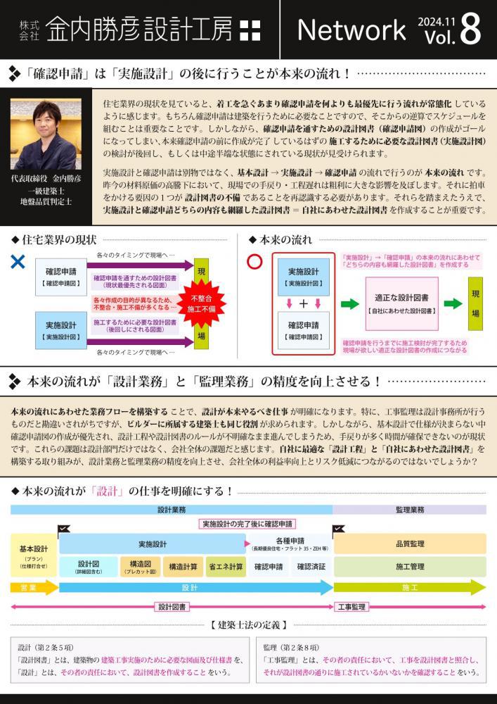 金内勝彦設計工房の情報誌『Network』Vol.8を発行しました。Networkには「人やモノをつないで情報や価値をお互いに共有しあっている状態」という意味があるそうです。そのように皆様とつながっていければと思い、命名しました。業界が今抱えている問題をどのように解決していけるか、弊社が取り組んでいることを交えながら、四半期ごとに発行しています。今回のトピックスは、◆「確認申請」は「実施設計」の後に行うことが本来の流れ!◆本来の流れが「設計業務」と「監理業務」の精度を向上させる!◆「現場からの声」と「施工管理の視点」を設計図書に落とし込む!※詳細についてはお問合せください
