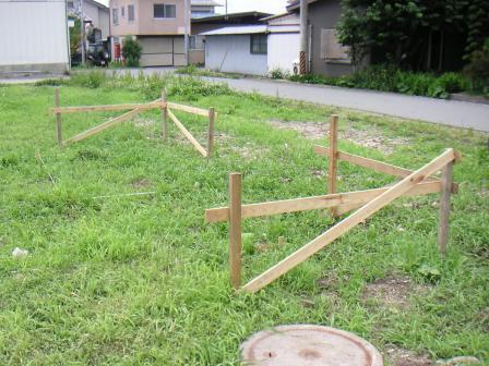 縄張りと遣りかたを確認しました。設計通りの位置に建物があるか、基礎や床が設計通りの高さになるかを確認します。