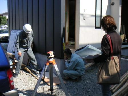 建て主のM子さんに立ち会っていただき、アプローチや駐車場のレベルなどを最終確認していることこです。
